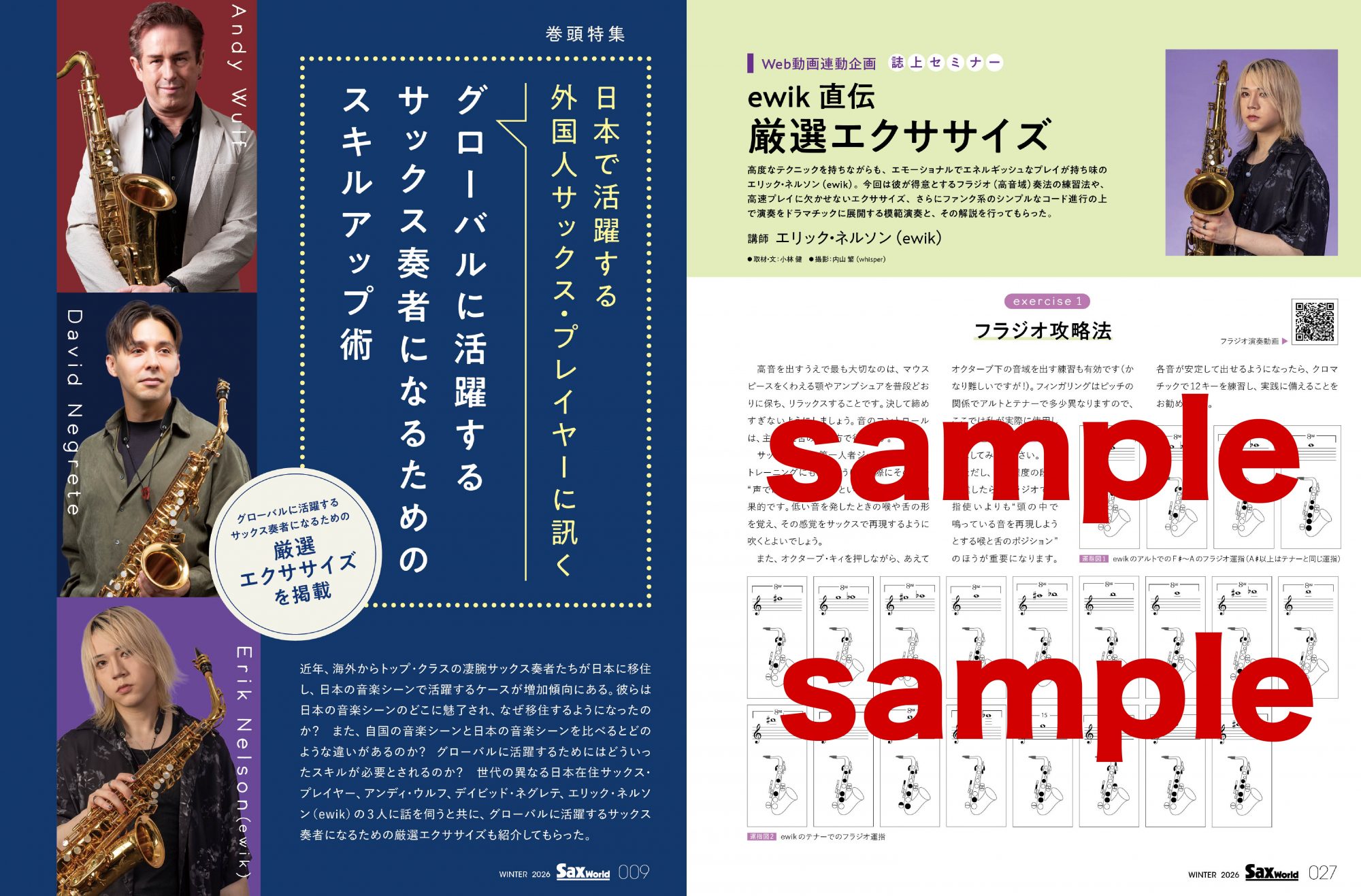 近年、海外からトップ・クラスの凄腕サックス奏者たちが日本に移住し、日本の音楽シーンで活躍するケースが増加傾向にある。彼らは日本の音楽シーンのどこに魅了され、なぜ移住するようになったのか? また、自国の音楽シーンと日本の音楽シーンを比べるとどのような違いがあるのか? グローバルに活躍するためにはどういったスキルが必要とされるのか? 世代の異なる日本在住サックス・プレイヤー、アンディ・ウルフ、デイビッド・ネグレテ、エリック・ネルソン(ewik)の3人に話を伺うと共に、グローバルに活躍するサックス奏者になるための厳選エクササイズも紹介してもらった。