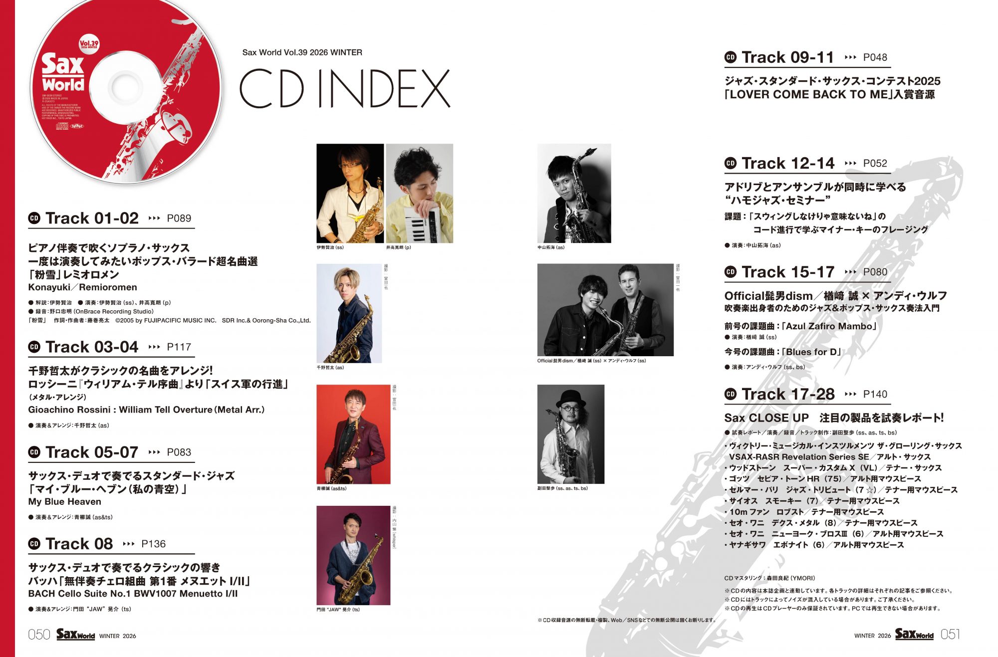 ご好評を頂いています付属CD連動スコア企画。今回もサックス演奏にマッチした選りすぐりの曲を、サックス・ワールドのオリジナル・アレンジでご用意させていただきました。カラオケ音源と一緒にぜひ演奏をお楽しみください!
