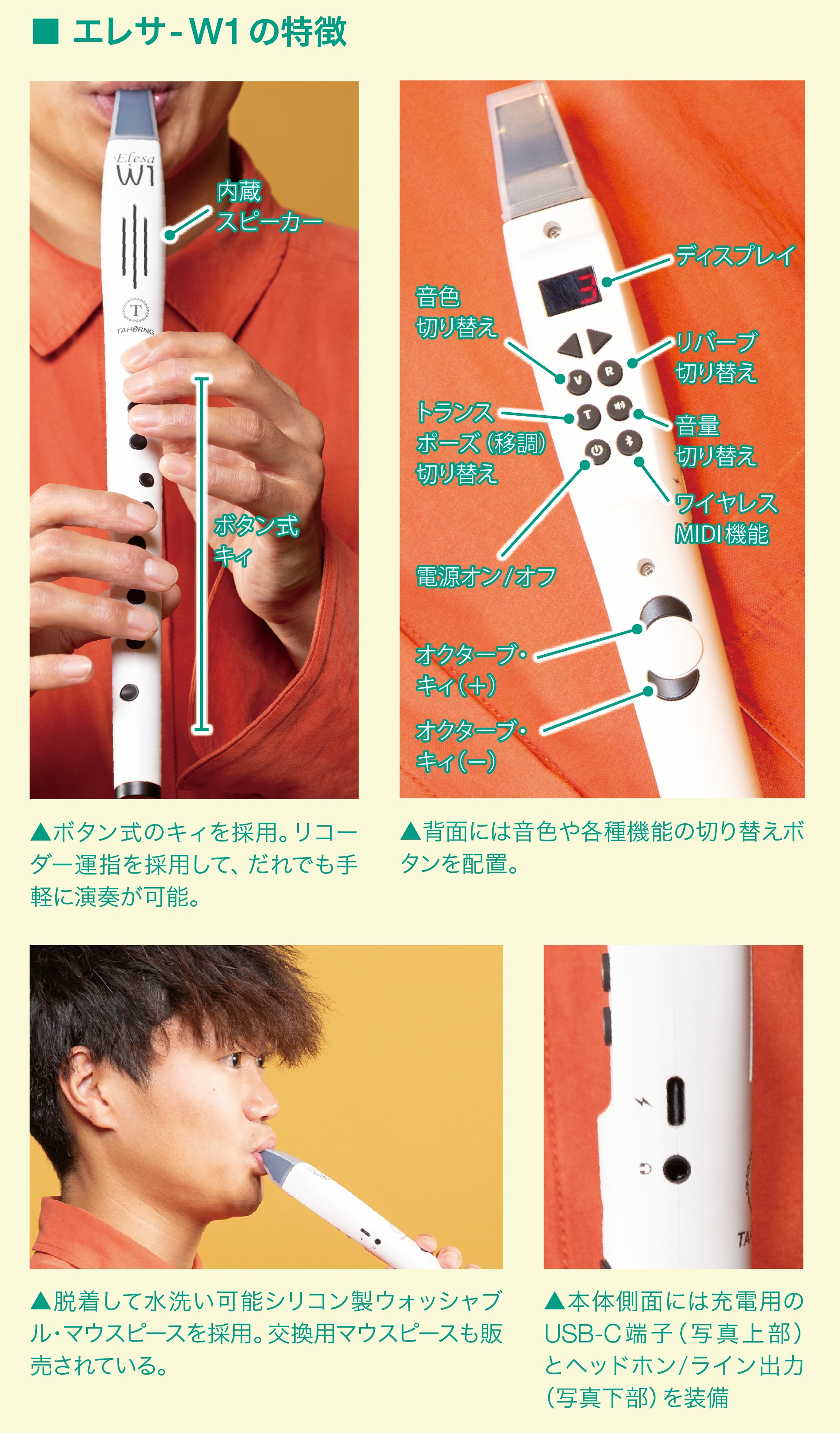 仕様:●運指:リコーダー ●音色 : 10音色 ●音域 : B2からG#5(オクターブ・スイッチおよび半音上下音孔併用)※音色によっては聴感上のオクターブが異なる場合があります●キー・トランスポーズ : -5半音~+6半音 ●本体材質 : ABS樹脂●エフェクト : リバーブ(オン/オフ可能) ●端子 : ヘッドホン/ライン出力、USB-Cタイプ ●電源 : 5V-USB電源/充電式リチウム電池内蔵(フル充電で3時間演奏可能) ●寸法 : 35.4 x 2.9 x 2.4 cm ●箱寸法 : 39.4 x 9.0 x 4.6 cm ●本体重量 : 114g ●付属品 : シリコン製ウォッシャブル・マウスピース、USB-Cケーブル、布製バッグ、日本語取扱説明書