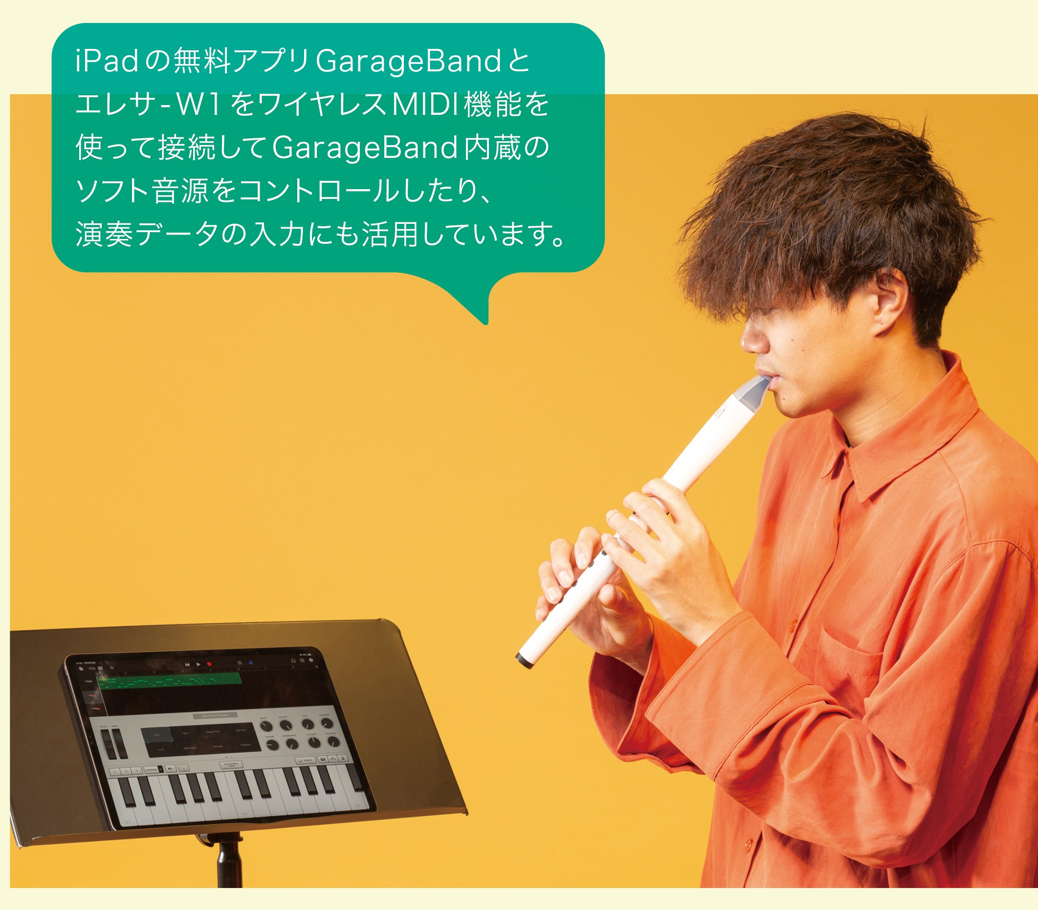 シンプルで気軽に吹ける楽器ですが、ワイヤレスMIDI機能も搭載していて、もう一歩進んだ使い方もできます。タブレットやパソコンとBluetooth接続することで、本体に内蔵されていない音色を演奏したり、DAWという録音/編集ソフトに演奏データを記録することが可能です。なんだか難しそうだと感じる方もいるかもしれませんが、iPadだとGarageBandという無料のDAWを使えますから、簡単にパッと繋ぐだけで楽しさが倍増します。これはぜひお薦めしたいですね。