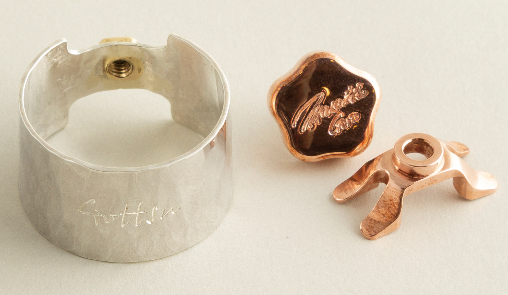 このリガチャーは、まさにシルバー(総銀)とブロンズ(銅)の良いとこ取り。吹奏感も音色もズッシリと落ち着くシルバーと倍音を含んだ甘い音色のブロンズが上手く融合しています。