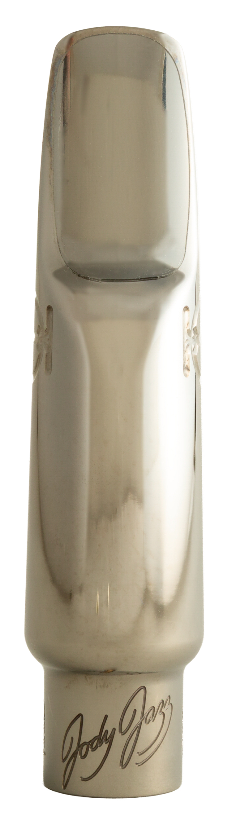 ジョディ・ジャズのテナー用メタル・マウスピースDV CHI(DVシカゴ)は、メタル素材にパラジウム・メッキが施されており、同社のトレードマークになっているテーブル部分の切り欠きがこのモデルもだいぶパックリといっています。